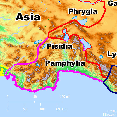 Pisidia, as a strict geographical term, was the name given to the huge block of mountain country stretching northward from the Taurus range where the latter overlooked the Pamphylian coast land, to the valleys which connected Apamea with Antioch, and Antioch with Iconium. It was bounded by Lycia on the West, by the Phrygian country on the North, and by Isauria on the East; but there is no natural boundary between Pisidia and Isauria, and the frontier was never strictly drawn. The name is used in its geographical sense in the Anabasis of Xenophon, who informs us that the Pisidians were independent of the king of Persia at the end of the 5th century B.C. Alexander the Great had difficulty in reducing the Pisidian cities, and throughout ancient history we find the Pisidian mountains described as the home of a turbulent and warlike people, given to robbery and pillage. The task of subjugating them was entrusted by the Romans to the Galatian king Amyntas, and, at his death in 25 B.C., Pisidia passed with the rest of his possessions into the Roman province Galatia. Augustus now took seriously in hand the pacification of Pisidia and the Isaurian mountains on the East Five military colonies were founded in Pisidia and the eastern mountains-Cremna, Comama, Olbasa, Parlais and Lystra-and all were connected by military roads with the main garrison city Antioch, which lay in Galatian Phrygia, near the northern border of Pisidia. An inscription discovered in 1912 shows that Quirinius, who is mentioned in Luke 2:2 as governor of Syria in the year of Christ's birth, was an honorary magistrate of the colony of Antioch; his connection with Antioch dates from his campaign against the Homonades-who had resisted and killed Amyntas-about 8 B.C. (see Ramsay in The Expositor, November, 1912, 385;, 406). The military system set up in Pisidia was based on that of Antioch, and from this fact, and from its proximity to Pisidia, Antioch derived its title "the Pisidian," which served to distinguish it from the other cities called Antioch. It is by a mistake arising from confusion with a later political arrangement that Antioch is designated "of Pisidia" in the majority of the manuscripts.