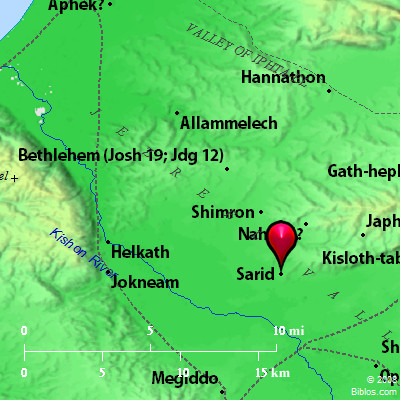 Atlas ![]() Sarid and surrounding area Maps Created using Biblemapper 3.0 Additional data from OpenBible.info You are free to use up to 50 Biblos coprighted maps (small or large) for your website or presentation. Please credit Biblos.com. Occurrences Joshua 19:10 The third lot came up for the children of Zebulun according to their families. The border of their inheritance was to Sarid.Joshua 19:12 It turned from Sarid eastward toward the sunrise to the border of Chisloth Tabor. It went out to Daberath, and went up to Japhia. Encyclopedia SARIDsa'-rid (saridh; Codex Vaticanus Esedekgola, Seddouk; Codex Alexandrinus Sarthid, Sarid): A place on the southern border of Zebulun to the West of Chisloth-tabor (Joshua 19:10, 12). It is mentioned but not identified in Eusebius, Onomasticon. Probably we should read "Sadid," and in that case may with Conder locate it at Tell Shaddu, an artificial mound with some modern ruins and good springs, which stands on the plain, about 5 miles West of Iksal. Strong's Hebrew H8301: Sariyda city on the border of Zebulun |