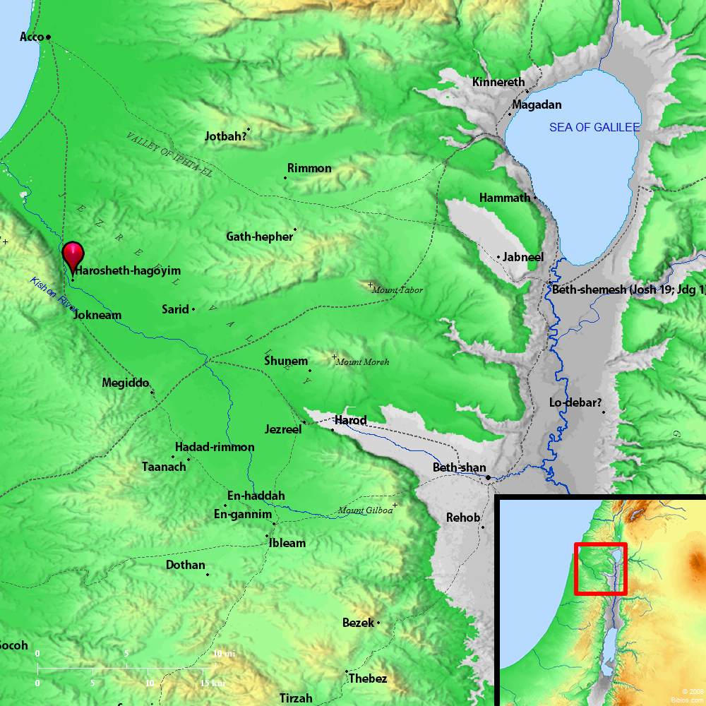Atlas ![]() Harosheth-hagoyim and surrounding region Maps Created using Biblemapper 3.0 Additional data from OpenBible.info You are free to use up to 50 Biblos coprighted maps (small or large) for your website or presentation. Please credit Biblos.com. Occurrences Judges 4:2 Yahweh sold them into the hand of Jabin king of Canaan, who reigned in Hazor; the captain of whose army was Sisera, who lived in Harosheth of the Gentiles.Judges 4:13 Sisera gathered together all his chariots, even nine hundred chariots of iron, and all the people who were with him, from Harosheth of the Gentiles, to the river Kishon. Judges 4:16 But Barak pursued after the chariots, and after the army, to Harosheth of the Gentiles: and all the army of Sisera fell by the edge of the sword; there was not a man left. Encyclopedia HAROSHETH, OF THE GENTILES, OF THE NATIONSha-ro'-sheth or (charosheth ha-goyim): There is now no means of discovering what is meant by the phrase "of the nations." This is the place whence Sisera led his hosts to the Kishon against Deborah and Barak (Judges 4:13), to which the discomfited and leaderless army fled after their defeat (Judges 4:16). No site seems so well to meet the requirements of the narrative as el Charithiyeh. There are still the remains of an ancient stronghold on this great double mound, which rises on the North bank of the Kishon, in the throat of the pass leading by the base of Carmel, from the coast to Esdraelon. It effectually commands the road which here climbs the slope, and winds through the oak forest to the plain; Megiddo being some 16 miles distant. The modern also preserves a reminiscence of the ancient name. By emending the text, Cheyne would here find the name "Kadshon," to be identified with Kedesh in Galilee (EB, under the word). On any reasonable reading of the narrative this is unnecessary. HARO'SHETH of the Gentiles, is with great probability to be located near the modern Harithiyeh, now a little mud village, 9 ms. almost due s.e. from Haifa, near the n.e. base of Mt. Carmel. It is mile e. of the river Kishon. Judg. 4:2, 13, 16, are the only references. Strong's Hebrew H2800: Charoshetha place in Palestine |