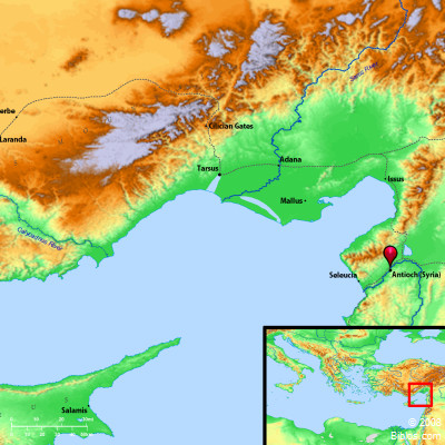 You are free to use up to 50 Biblos coprighted maps (small or large) for your website or presentation. Please credit Biblos.com. Occurrences Acts 6:5 These words pleased the whole multitude. They chose Stephen, a man full of faith and of the Holy Spirit, Philip, Prochorus, Nicanor, Timon, Parmenas, and Nicolaus, a proselyte of Antioch; Acts 11:19 They therefore who were scattered abroad by the oppression that arose about Stephen traveled as far as Phoenicia, Cyprus, and Antioch, speaking the word to no one except to Jews only. Acts 11:20 But there were some of them, men of Cyprus and Cyrene, who, when they had come to Antioch, spoke to the Hellenists, preaching the Lord Jesus. Acts 11:22 The report concerning them came to the ears of the assembly which was in Jerusalem. They sent out Barnabas to go as far as Antioch, Acts 11:26 When he had found him, he brought him to Antioch. It happened, that for a whole year they were gathered together with the assembly, and taught many people. The disciples were first called Christians in Antioch. Acts 11:27 Now in these days, prophets came down from Jerusalem to Antioch. Acts 13:1 Now in the assembly that was at Antioch there were some prophets and teachers: Barnabas, Simeon who was called Niger, Lucius of Cyrene, Manaen the foster brother of Herod the tetrarch, and Saul. Acts 14:26 From there they sailed to Antioch, from where they had been committed to the grace of God for the work which they had fulfilled. Acts 15:22 Then it seemed good to the apostles and the elders, with the whole assembly, to choose men out of their company, and send them to Antioch with Paul and Barnabas: Judas called Barsabbas, and Silas, chief men among the brothers. Acts 15:23 They wrote these things by their hand: "The apostles, the elders, and the brothers, to the brothers who are of the Gentiles in Antioch, Syria, and Cilicia: greetings. Acts 15:30 So, when they were sent off, they came to Antioch. Having gathered the multitude together, they delivered the letter. Acts 15:35 But Paul and Barnabas stayed in Antioch, teaching and preaching the word of the Lord, with many others also. Acts 18:22 When he had landed at Caesarea, he went up and greeted the assembly, and went down to Antioch. Galatians 2:11 But when Peter came to Antioch, I resisted him to his face, because he stood condemned. Encyclopedia ANTIOCH, IN SYRIAan'-ti-ok, (Antiocheia).